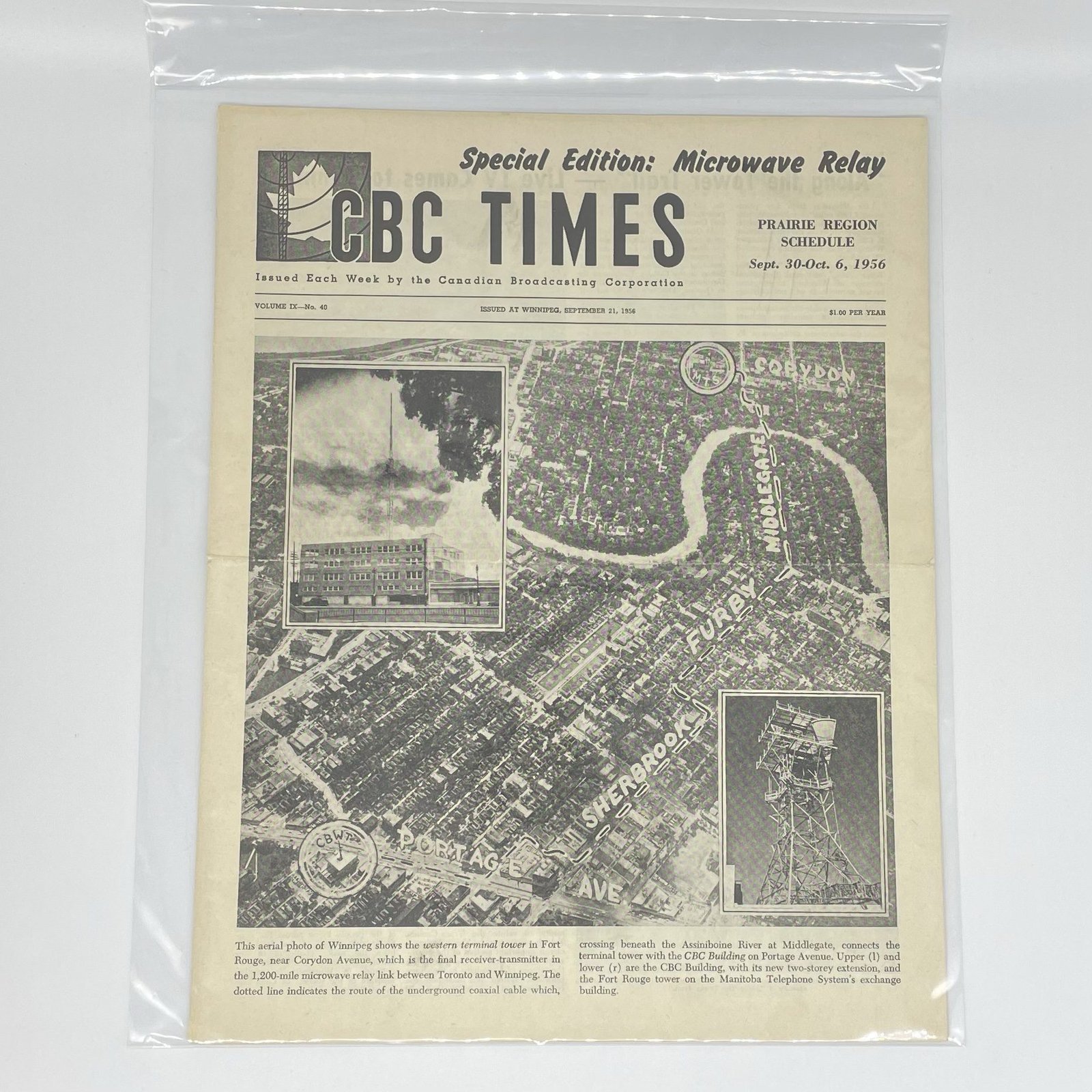 Features coverage of microwave tower bring live programming from the east to the prairies as well as information on local and national CBC radio and television programming. Comes in protective sleeve.