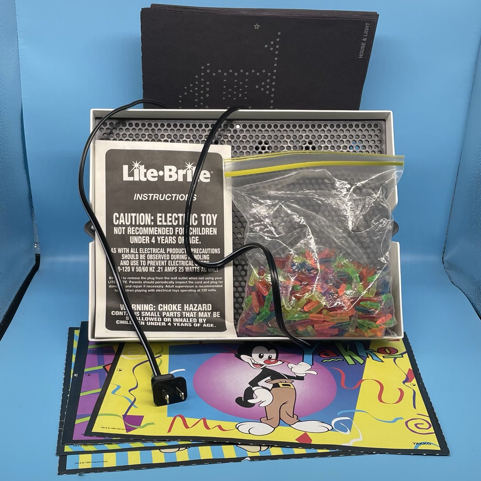 Includes instructions, pegs and about 20 unused sheets, including a few 1995 sheets from Animaniacs, Pinky and the Brain and others.