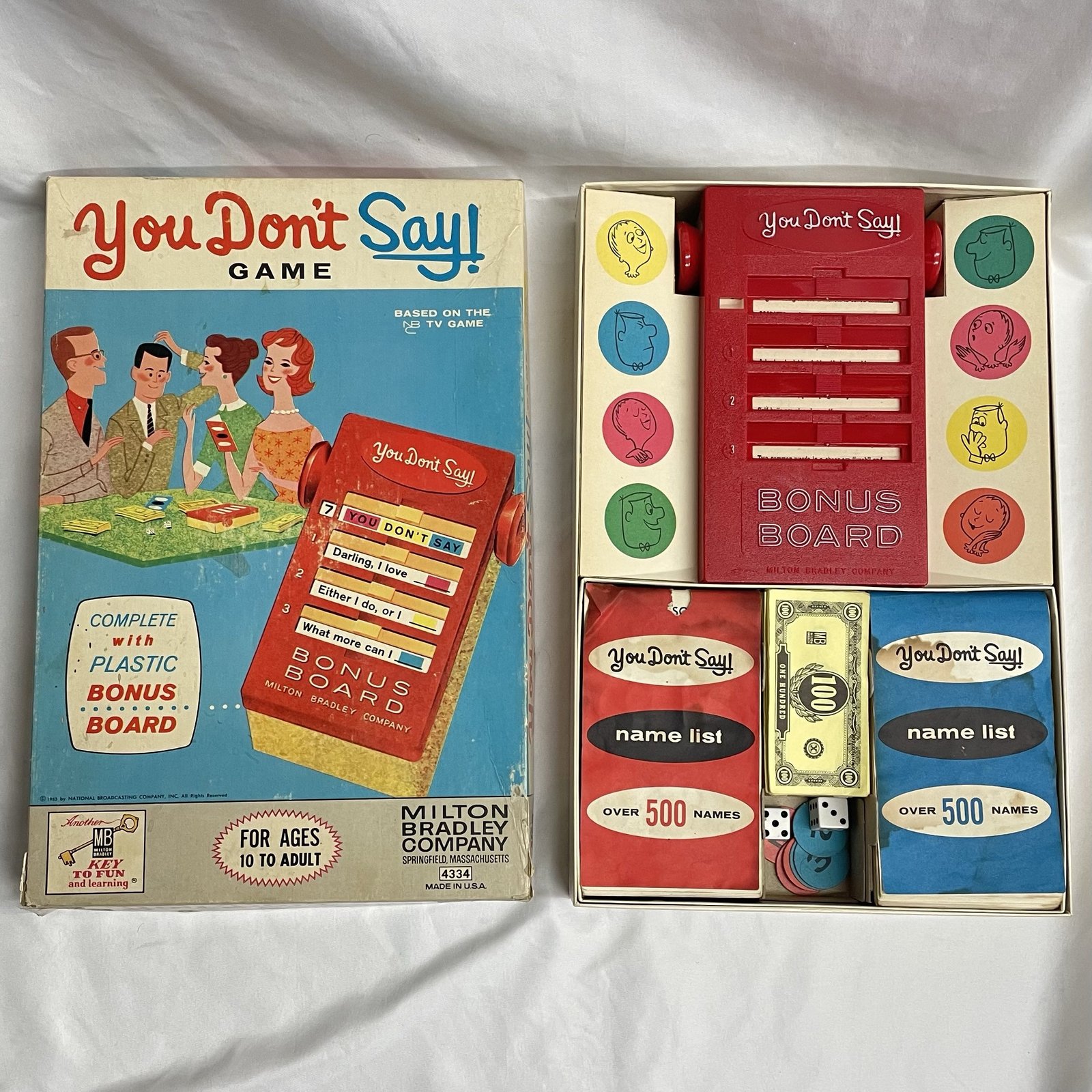 Game is complete. Dice are not original. Name lists have some staining